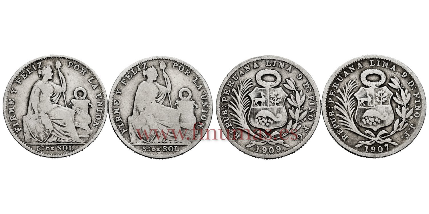 PERU - K-205 - Lote 1/5 Sol 1907 y 1909 - BC