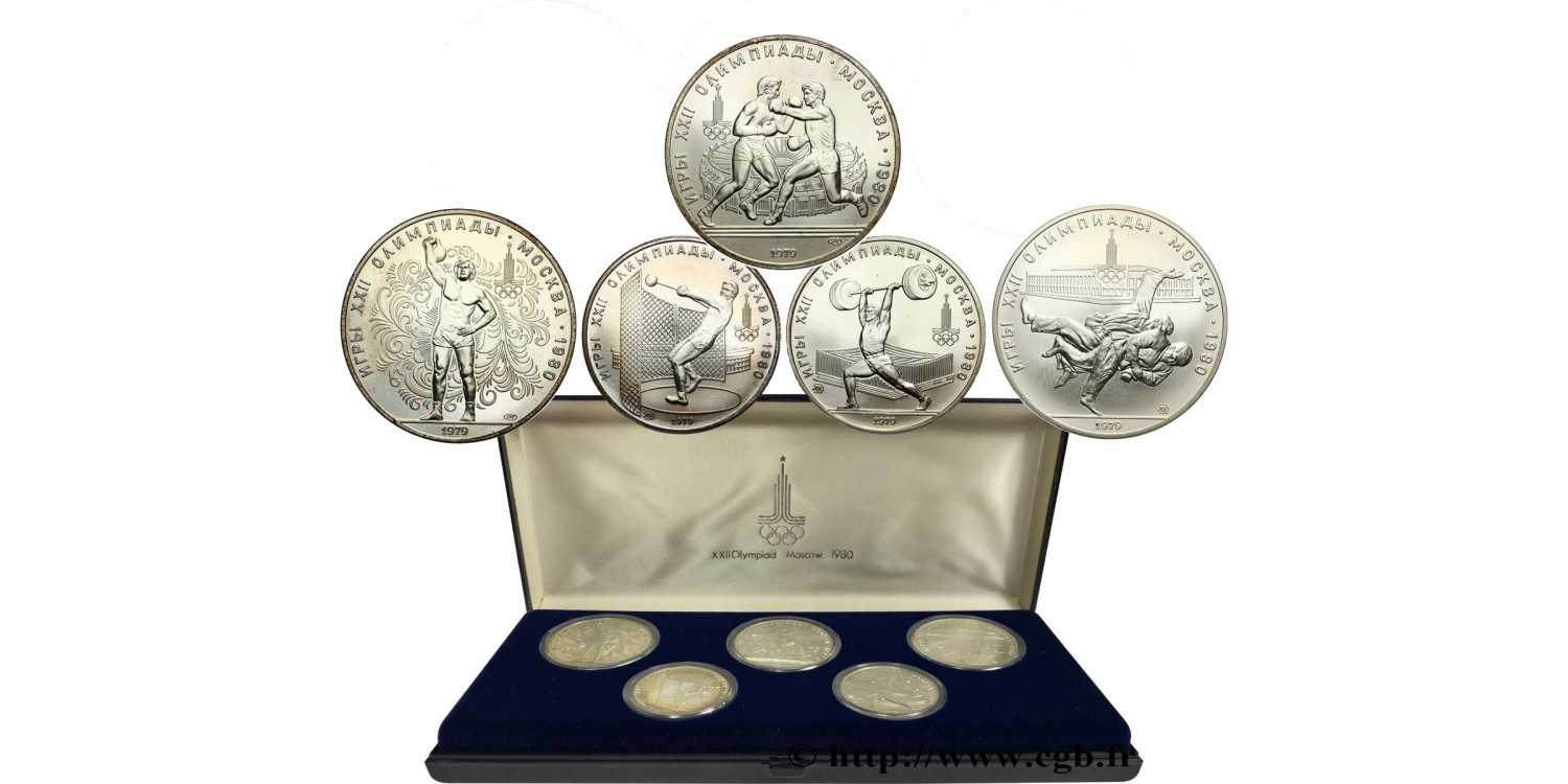Estuche oficial de 6 monedas de 1979 en plata fina. Conmemorando la olimpiada de moscu de 1980. 2 xMonedas 5 roublos: 33 mm de diametro, peso, 0.5359 onza troy. (16,67 gr.) 3 x Monedas 10 rublos: 39 mm de diametro, peso, 1,071 onza troy..(33,31 gr.)