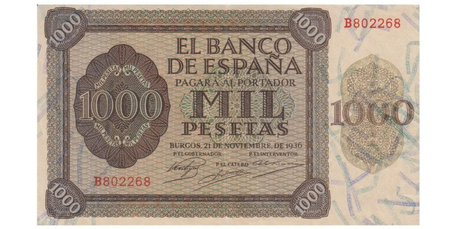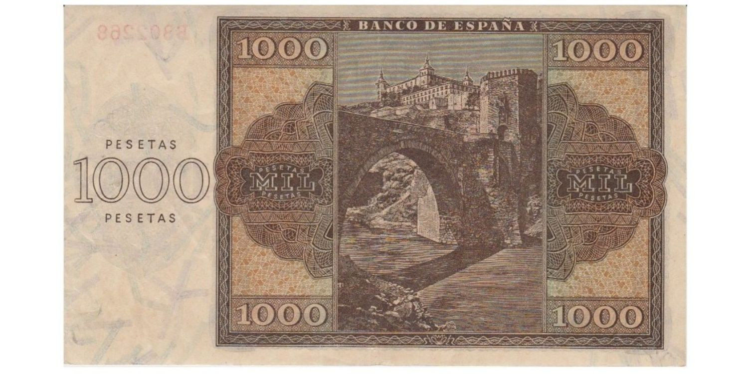 1000 Pesetas 21 De Noviembre 1936. Alcazar de Toledo. Doblez central disimulada y algo falto de apresto, pero con muy buen aspecto general. EBC/EBC-