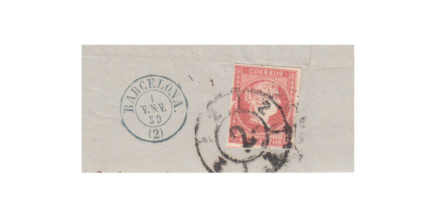 4 Cuartos1856 - Rueda de carreta Nº 2 - Barcelona - sobre fragmento con fechador azul