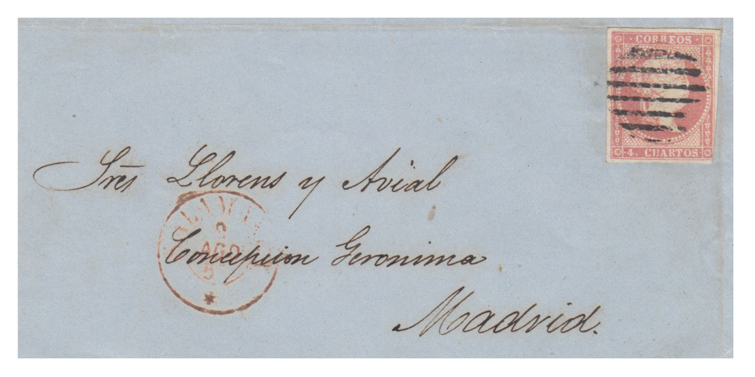4 cuartos1856 - Parrilla Negra sobre fragmento y fechador Salamanca tipo 1 en rojo