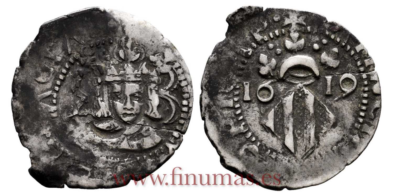 Divuité Valenciano. Felipe III 1619. Plata (Ag) 1'80gm. Cospel parcialmente abierto