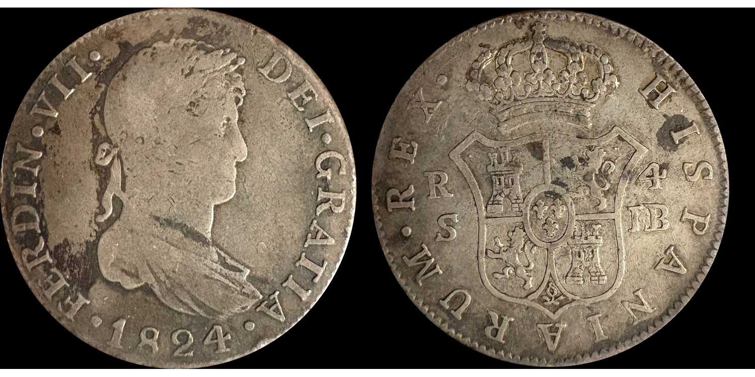 Fernando VII 4 reales 1824 Sevilla JB. (Cal-814). Plata (Ag.) 13,45 g. MBC. Patina