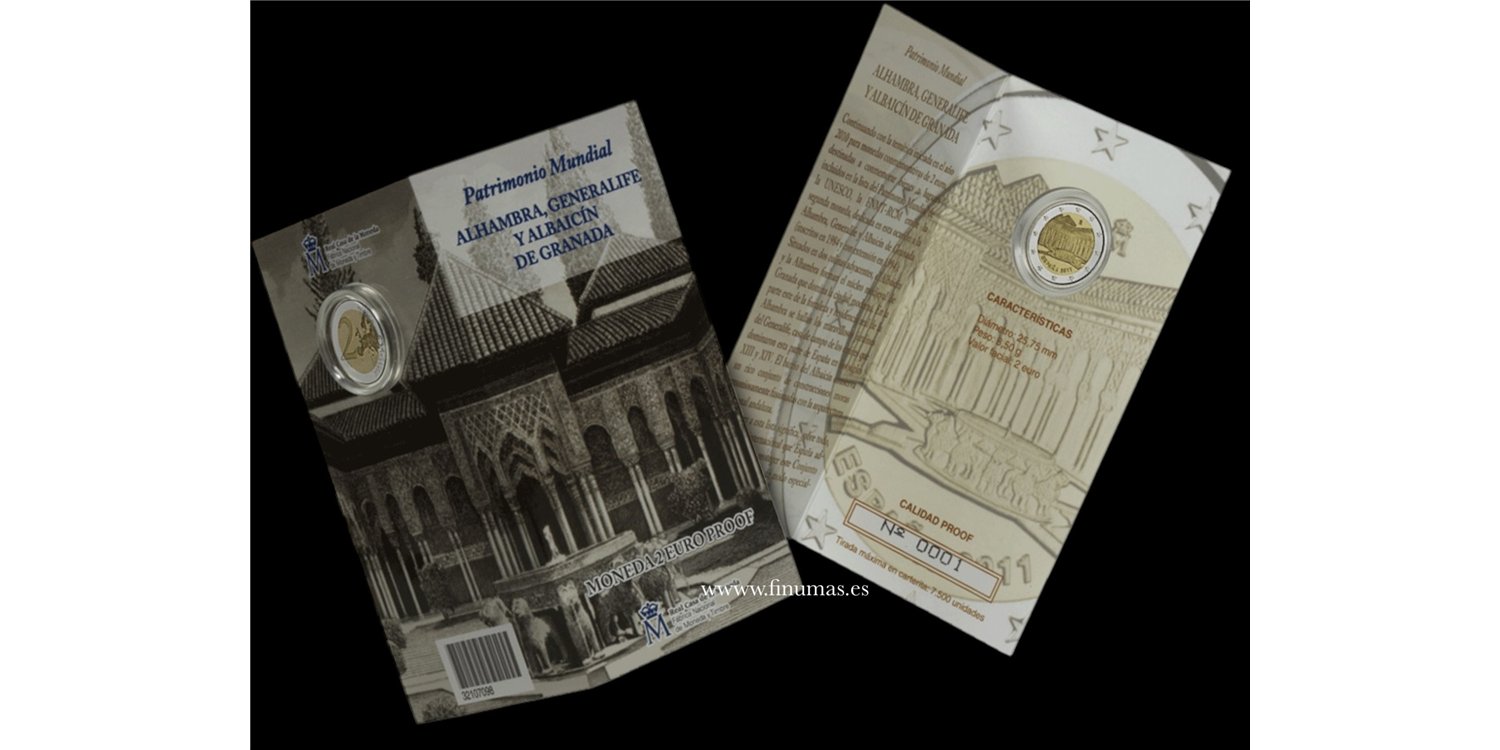Moneda de 2 euro conmemorativa, acuñada en calidad proof, se presenta en una elegante carterita numerada que protege la moneda y, al mismo tiempo, permite la perfecta visualización de ambas caras de la misma. En el anverso de dicha moneda, se reproduce una imagen del Patio de los Leones, en conmemoracion de la Alhambra, Generalife y Albaicin de Granada.