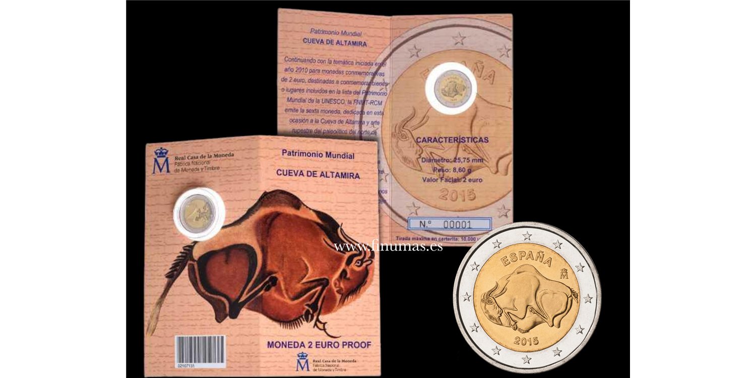 Moneda de 2 euro conmemorativa, acuñada en calidad proof, se presenta en una elegante carterita numerada que protege la moneda y, al mismo tiempo, permite la perfecta visualización de ambas caras de la misma. En el anverso de dicha moneda, se reproduce una imagen de las pinturas de las Cuevas de Altamira, en Cantabria.