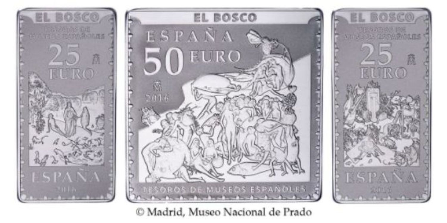 Emisión está dedicada a Jheronimus van Aken, más conocido como el Bosco,con motivo del V Centenario de su muerte En los anversos a color, el panel central del tríptico “El Jardín de las Delicias”, realizada entre 1500 y 1505 por el Bosco. Actualmente conservada en el Museo Nacional del Prado, en Madrid. En los reversos se reproducen detalles de los tres paneles que conforman el mencionado tríptico.