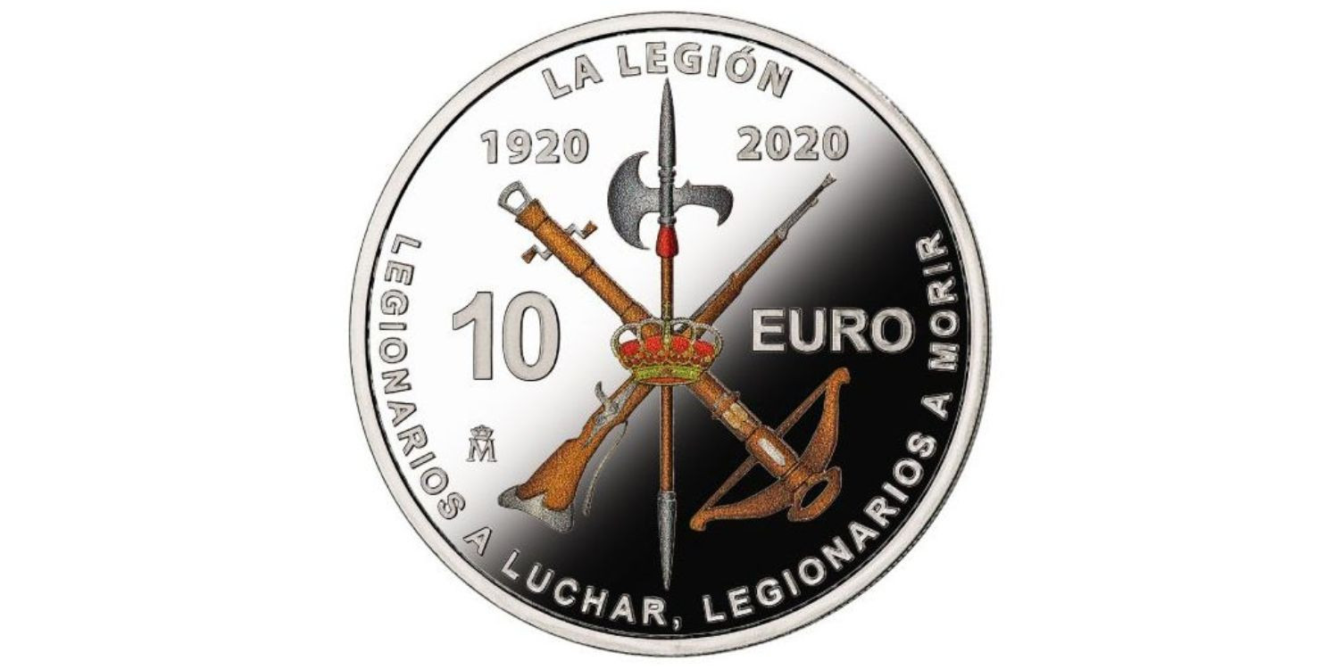 El reverso en la parte central, se reproduce en colores el emblema de la Legión española. A la izquierda, la cifra 10 y, más abajo, la marca de Ceca; a la derecha, en mayúsculas, la leyenda EURO. En la parte superior de la moneda, en sentido circular y en mayúsculas, la leyenda LA LEGIÓN. Debajo, las fechas 1920 y 2020. En la parte inferior de la moneda, en sentido circular y en mayúsculas, las leyendas LEGIONARIOS A LUCHAR y LEGIONARIOS A MORIR, separadas por un punto.