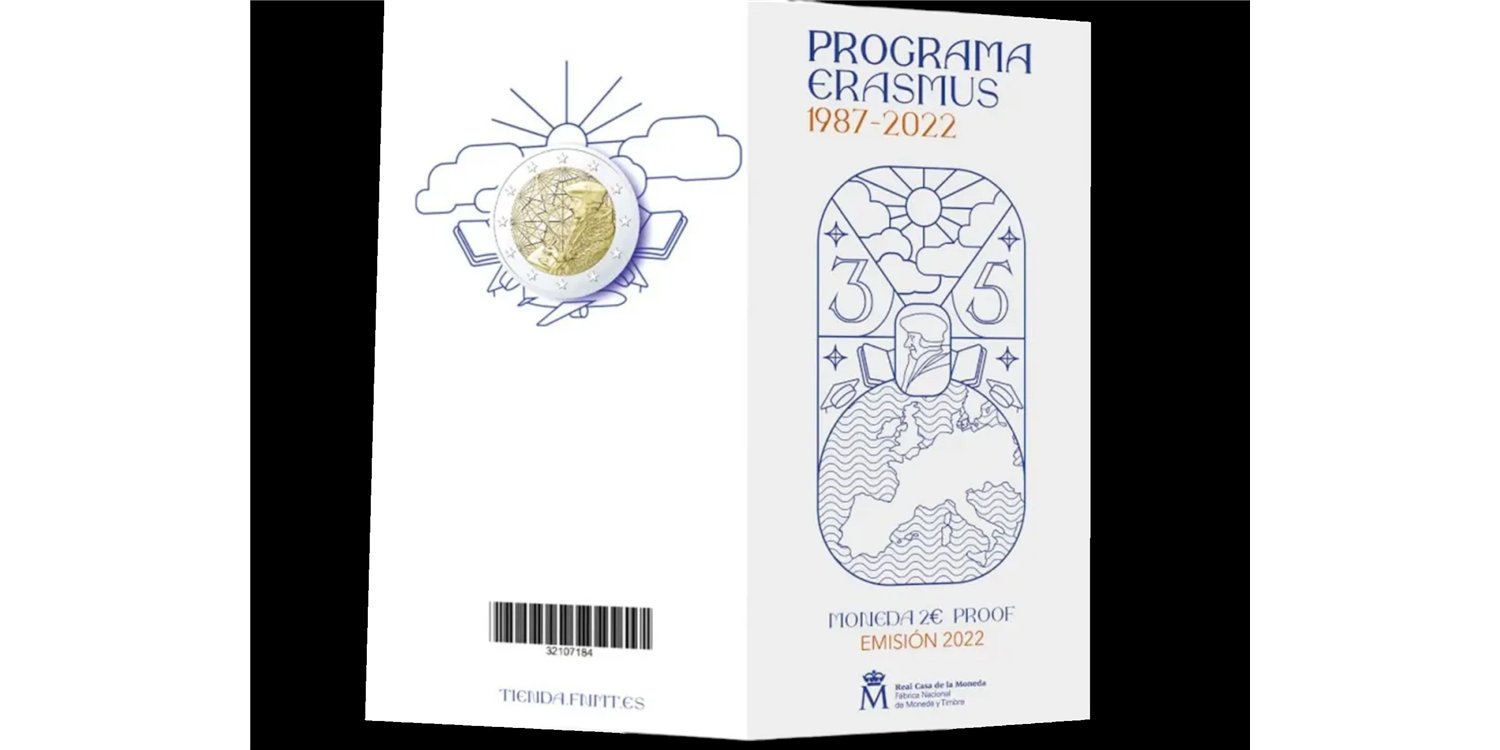 Moneda de 2 euro conmemorativa, acuñada en calidad proof, se presenta en una elegante carterita numerada que protege la moneda y, al mismo tiempo, permite la perfecta visualización de ambas caras de la misma. En el anverso de dicha moneda, se reproduce la imagen del retrato de Erasmo de Róterdam sobre un haz de enlaces que atraviesa el fondo central de la moneda formando el número 35, en conmemoracion del 35 aniversario del programa ERASMUS.