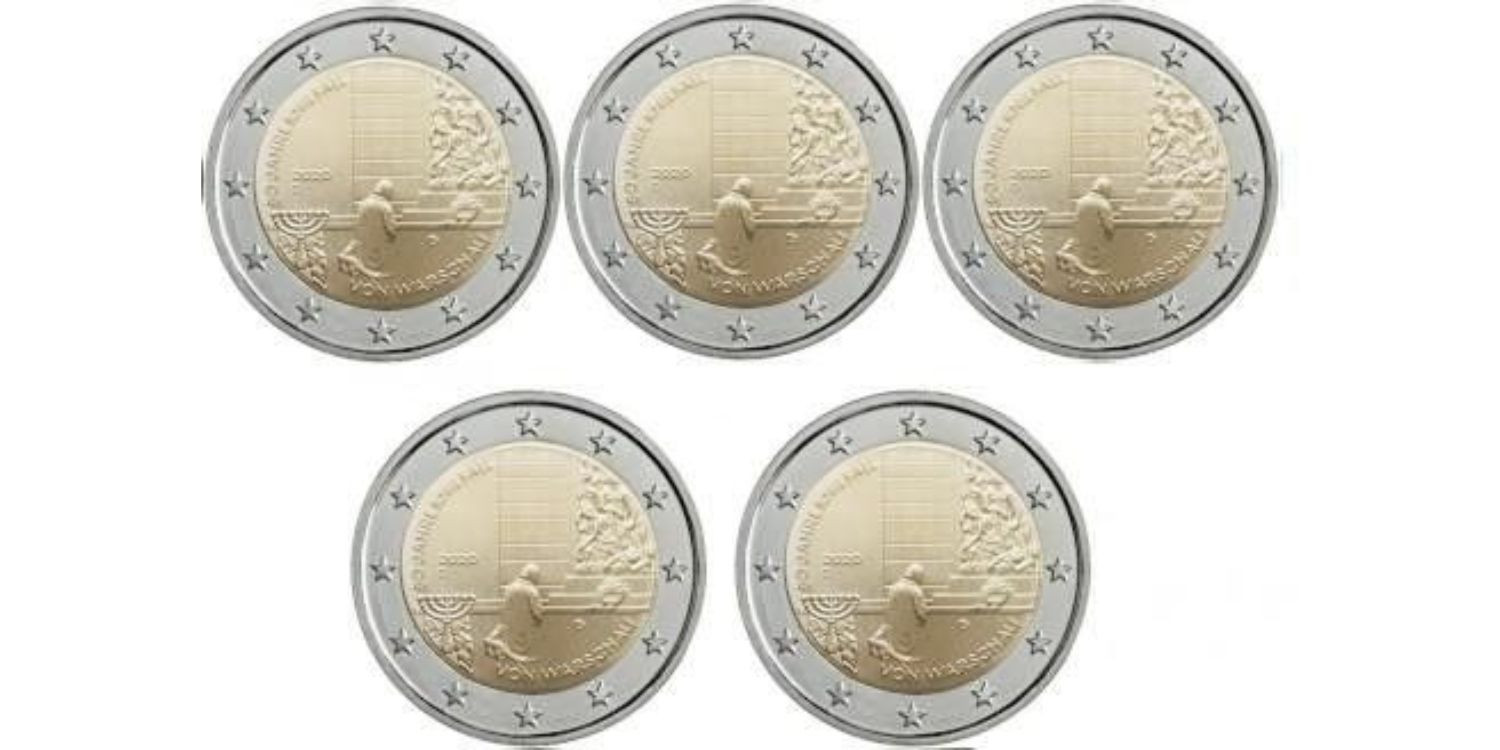 Set of 5 different mintages of the 2€ commemorative coin GERMANY 2020 commemorating the "50th Anniversary of the Warsaw Genuflection". Historical event that took place on 7 December 1970, when Chancellor Willy Brandt knelt at the memorial of the Warsaw ghetto uprising, where thousands of Jews died, victims of the Nazis during World War II"