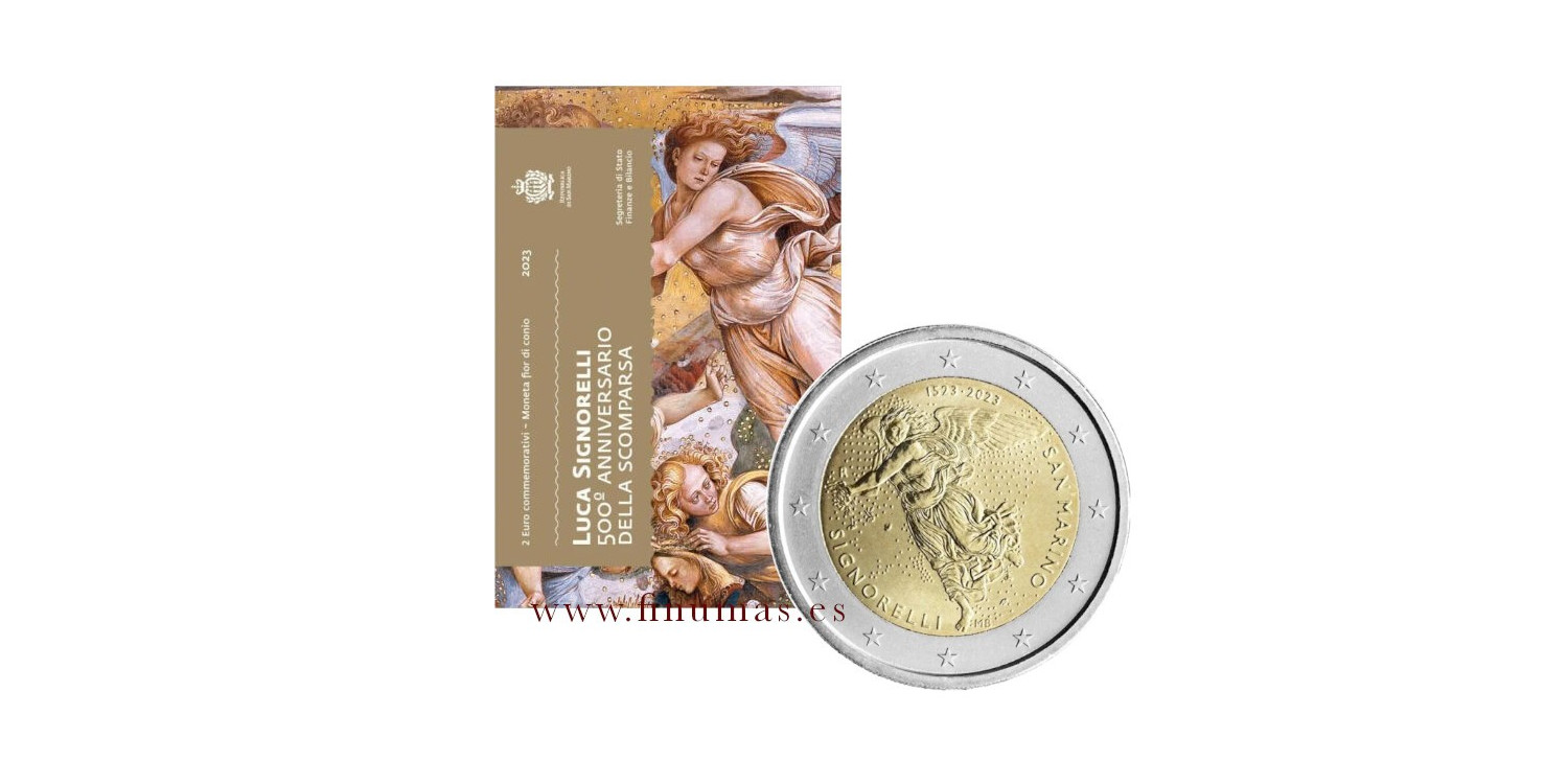 2 euro commemorative San Marino commemorative coin of 2023 dedicated to the Italian Fourteenth century painter LUCA SIGNORELLI on the 500th anniversary of his death. He is one of the great masters of the so-called Umbrian School..,
