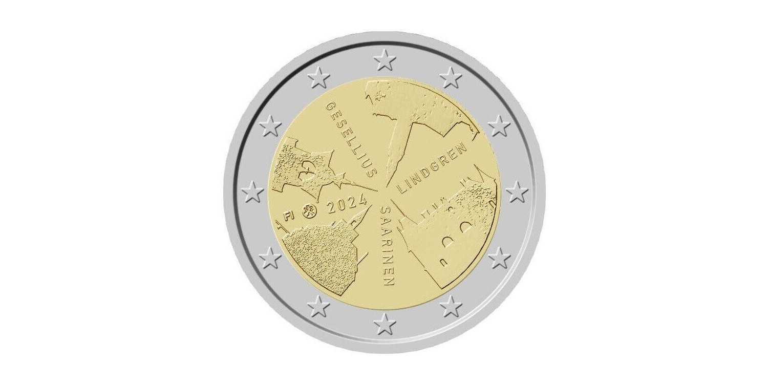 2 euro commemorative 2024 issued in commemoration of the Finnish architectural firm Gesellius-Lindgren-Saarinen, founded in 1896 by Hermann Gesellius, Armas Lindgren and Eliel Saarinen