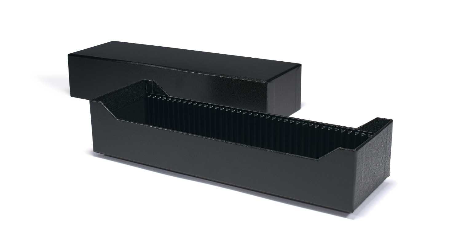 The matt black archive box offers functional elegance. It is an elegant way to store coin cards or bullion blisters (85 x 54 mm), and stands out visually on any shelf. - Internal dividers for convenient sorting - Outer format: 300 x 100 x 60 mm