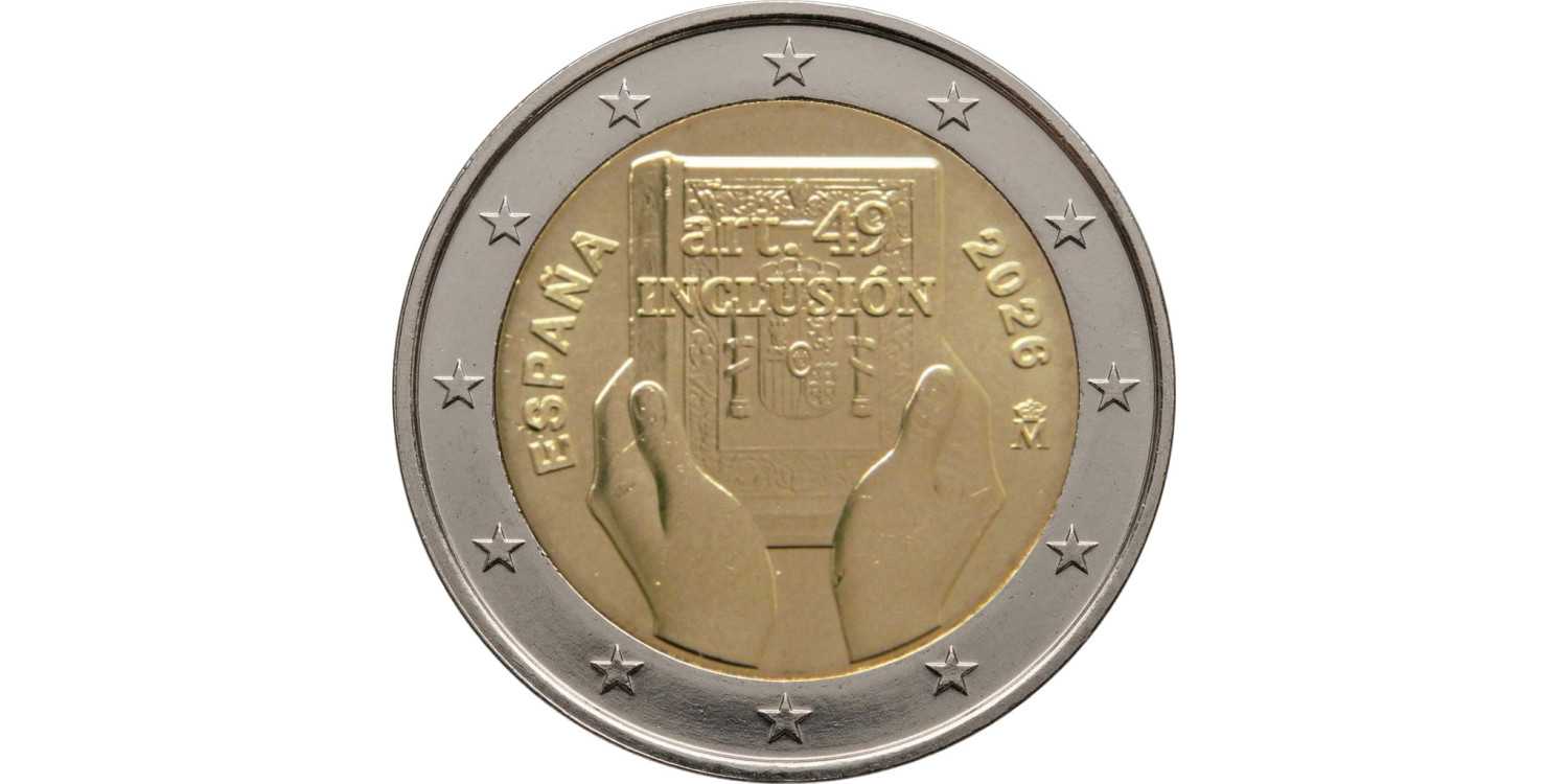 2 euro commemorative 2026, issued with the slogan "Spain and disability: protection, rights and inclusion" and in commemoration of the reform of article 49 of the Spanish Constitution, approved to adapt its content to the Rights of Persons with Disabilities.