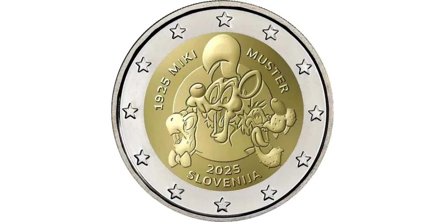 2 euro commemorative 2025 commemorating the 100th birthday of Nikolaj Mustermas known as Miki Muster. Slovenian sculptor, illustrator, cartoonist and animator, pioneer of Slovenian comics and animation. His best known characters were Zvitorepec, Trdonja and Lakotnik, each of them depicted on the coin.