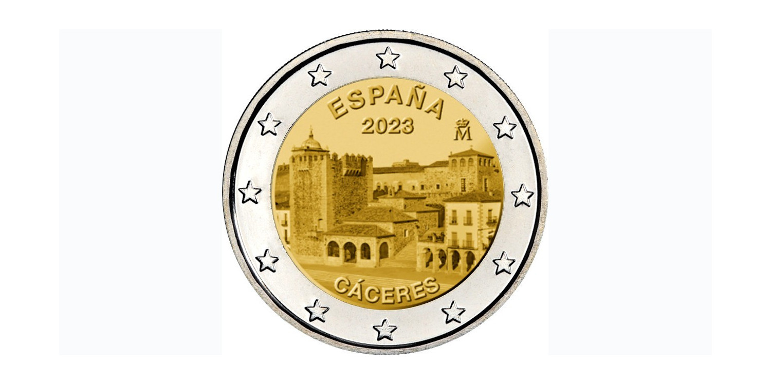 2 euro commemorative coin 2023 dedicated to the Old City of Caceres, declared World Heritage of Humanity in 1986