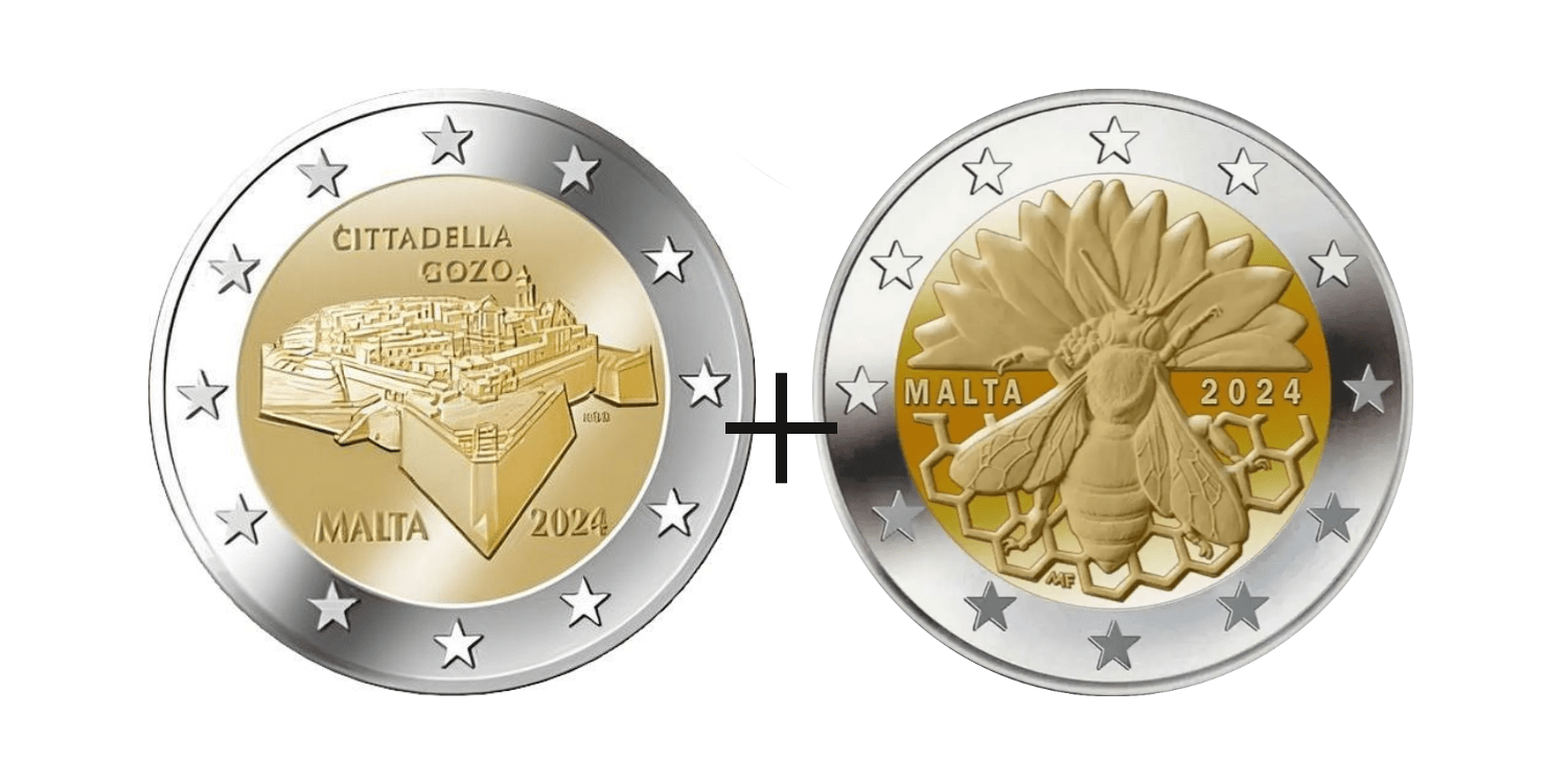 Set of 2 commemorative coins of Malta 2024, dedicated to the Bee of Malta and the Citadel of Goz. The latter inaugurates a new series called Walled Cities of Malta, being the first of the series.