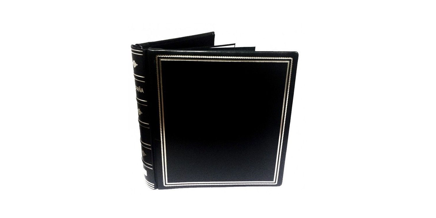 Stamp album made in Fibrapiel, padded, round spine. Engraved in gold. Silk covers. Inscription on the spine with or without "Spain". Automatic 15-ring binder. Protective box. Colours Green, Red and Black. Leaves not included. Measurements: 229,5 x 331,5 mm.