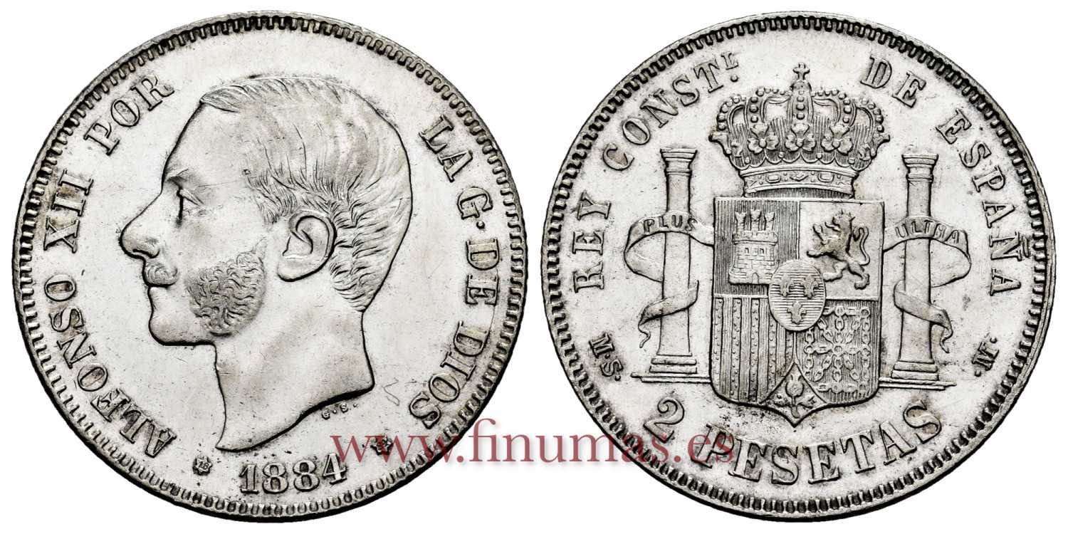 Alfonso XII 2 pesetas. 1884*18-84. Madrid. MSM (Cal-34). Ag. 10,00 g. . Part original lustre. Scarce in this superb preservation. SC.