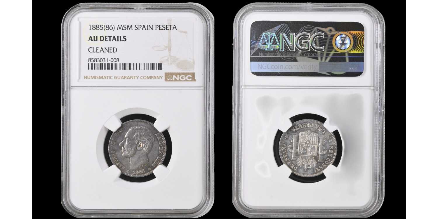 1 peseta. 1885 ( _ - 86). Madrid. MSM. Silver (Ag). 5,00 g. Minted under Alfonso XIII. First anepigraphic star. Original lustre. Very scarce in this preservation. NGC AU DETAILS