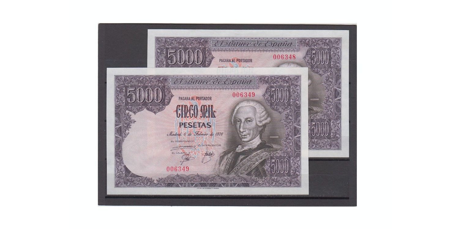 Correlative pair of 5000 Pesetas 6-2-1976 Carlos III. Low numbering 006348 - 006349. Uncirculated Quality