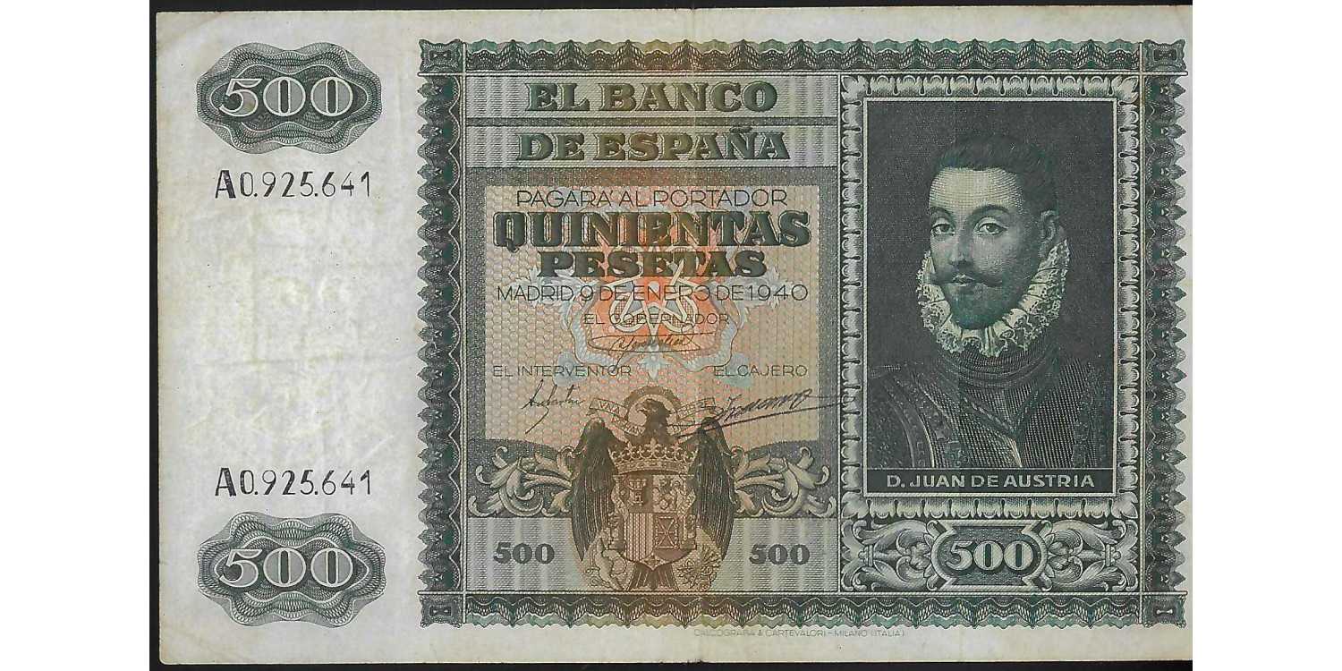 500 pesetas of JUAN DE AUSTRIA. Good general appearance, but a little lacking in sizing, perhaps due to ironing