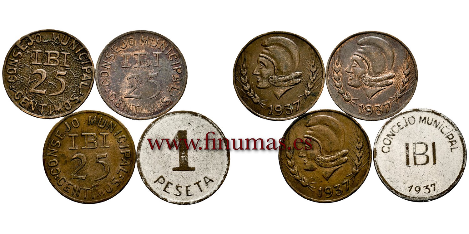 GUERRA CIVIL. CONSEJO MUNICIPAL DE IBI (ALICANTE). Serie completa de 4 monedas. Las 3 variantes de 25 Céntimos "Mapa España", 25 Céntimos "2 sobre E" y 25 Céntimos "2 sobre CE" y 1 Peseta (cobre niquelado