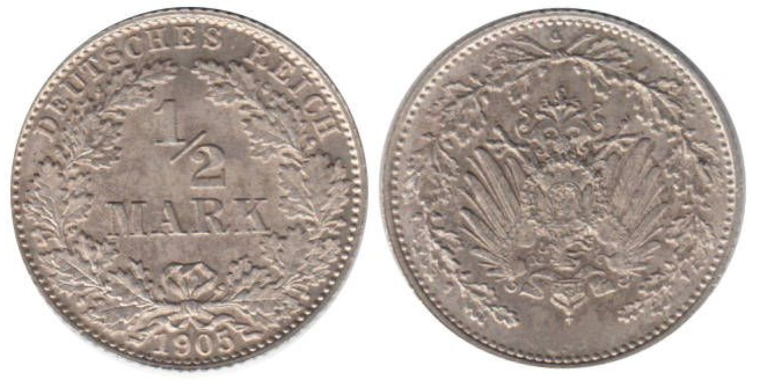 GERMANY EMPIRE - K-017 - 1/2 MARK 1905 D, SC silver