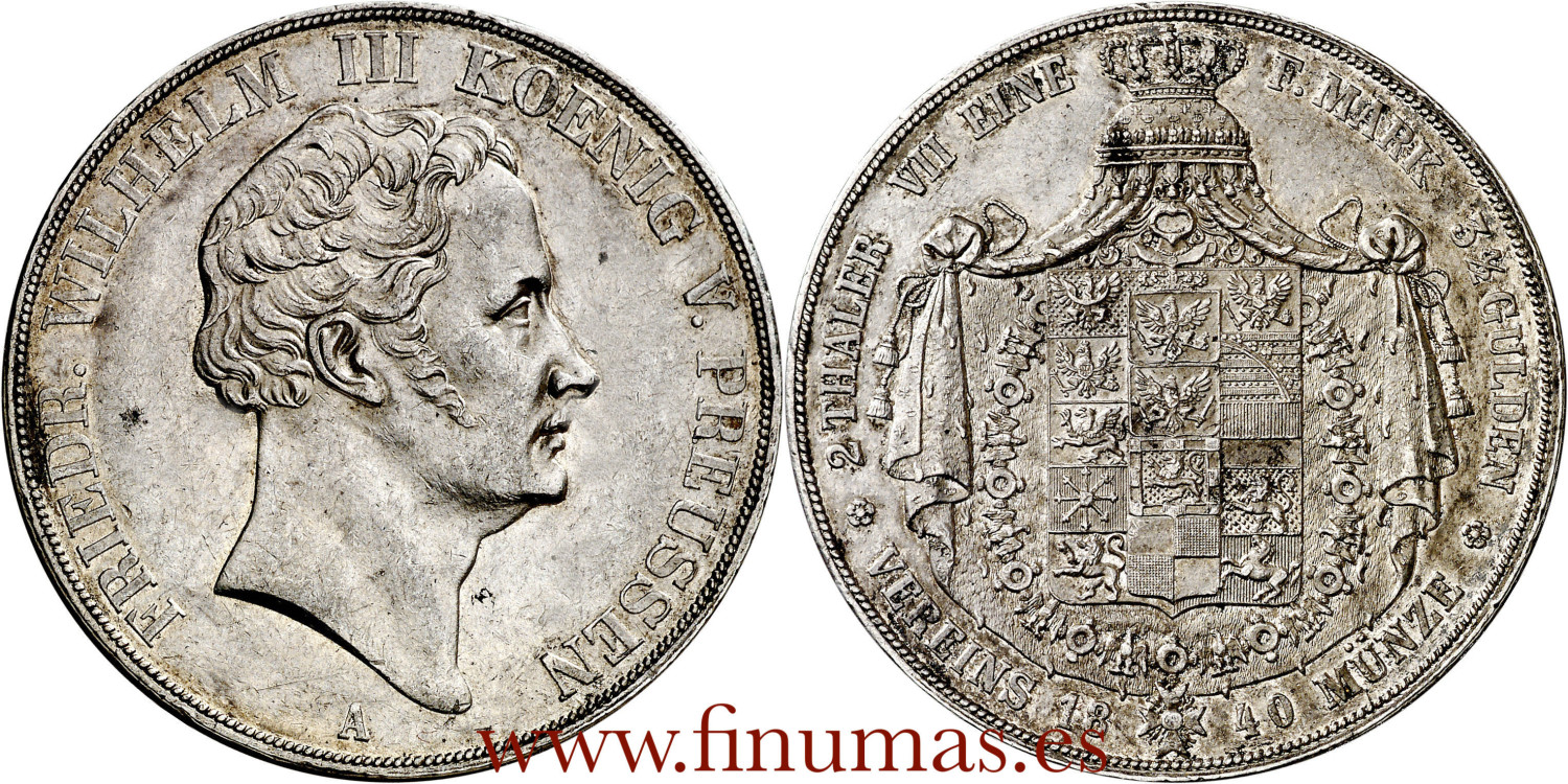 Germany. Prussia. 1840. Frederick William III. A (Berlin). Double taler (KM. 425). Minimal marquettes. Fine. Original lustre. Rare like this. AG. 37,08 g.