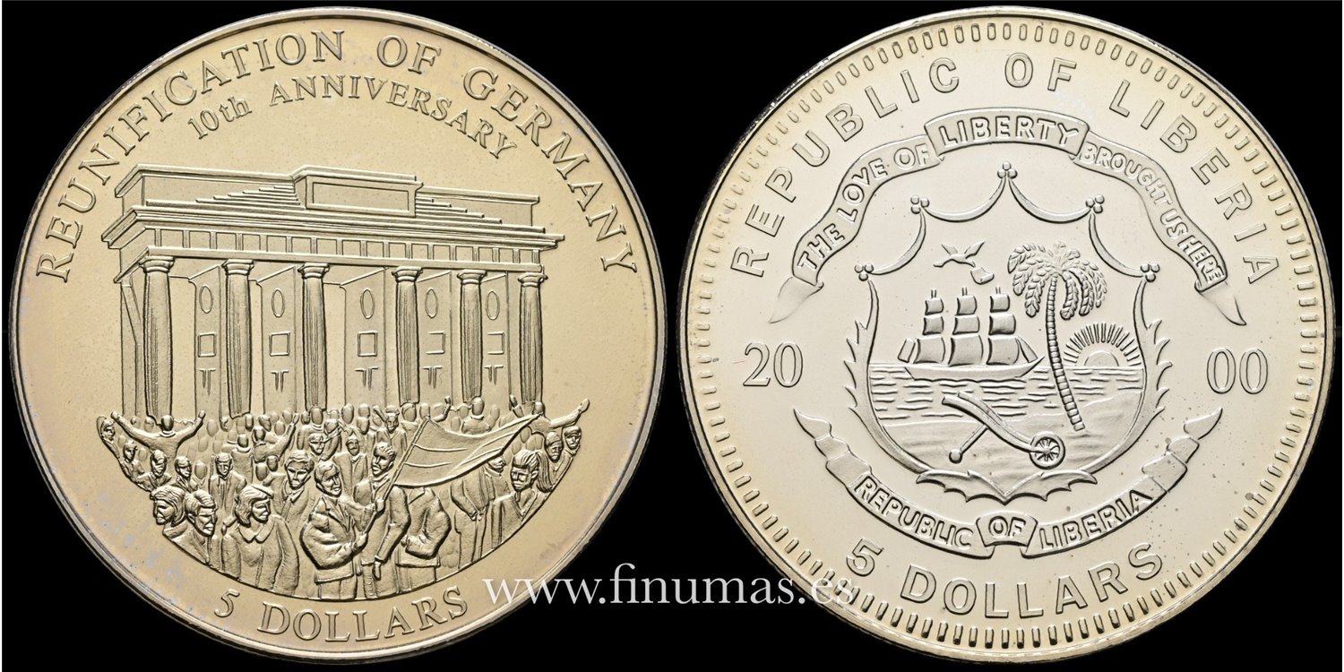 Liberia 5 Dollars 2000 Reunificación de Alemania. Niquel 27,2gm