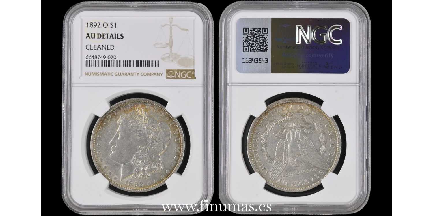 Dólar Morgan EE.UU. 1892 O (Nueva Orleans). Encapsulada y graduada por NGC como AU Details. Disponemos de varias unidades en Stock. El numero de certificado puede no coincidir con la de la foto.