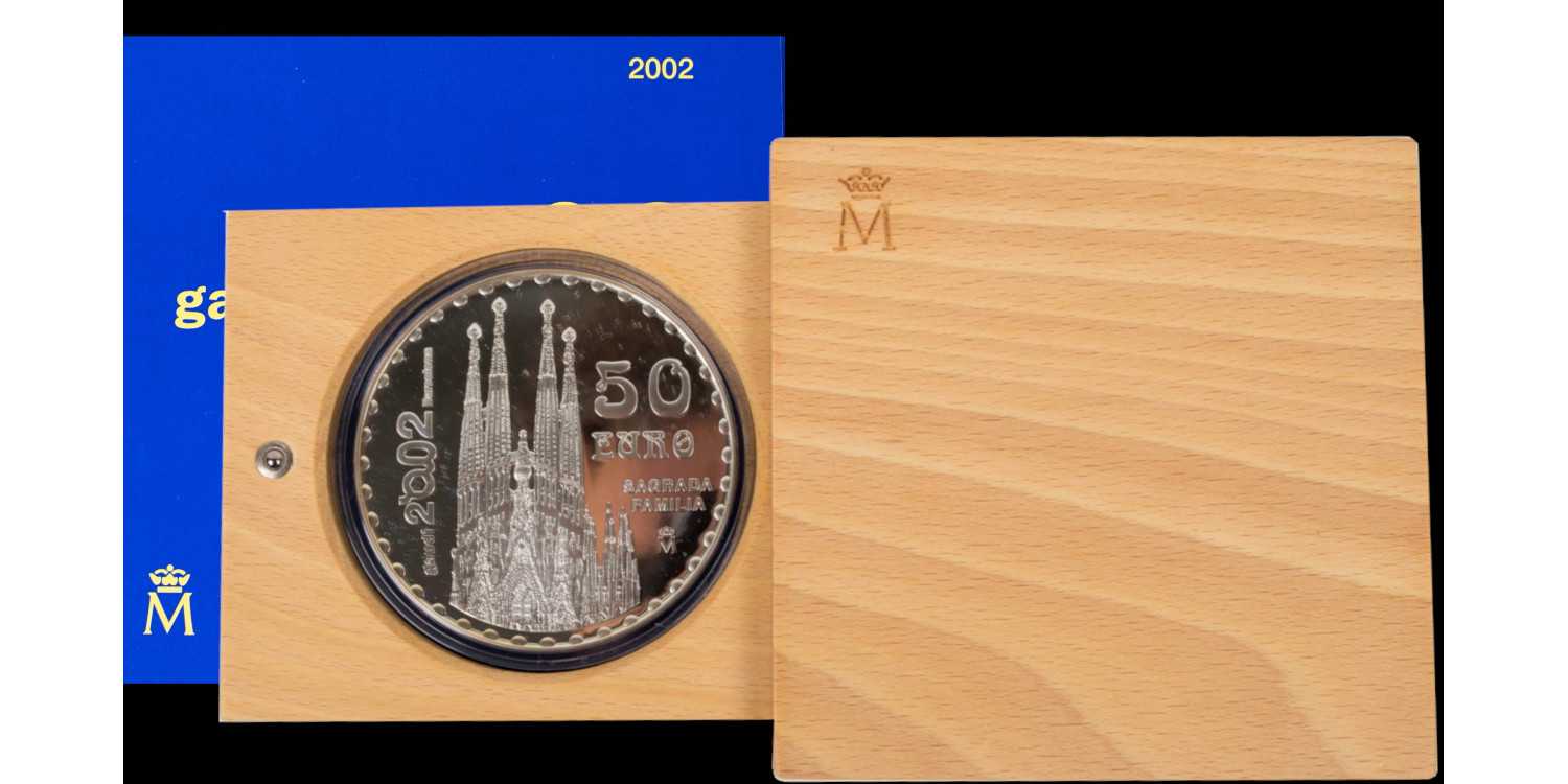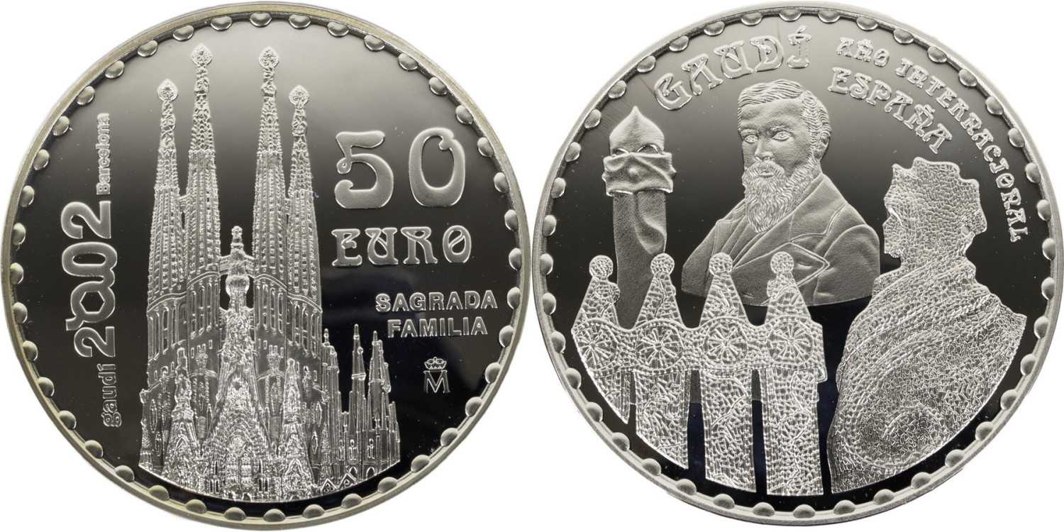 The front shows Gaudí's face and his architectural elements. On the reverse, the Expiatory Temple of the Sagrada Familia...