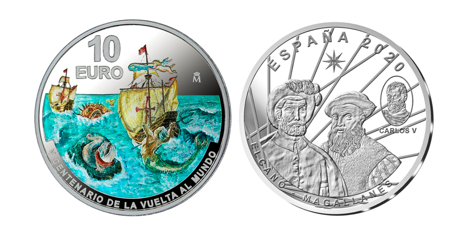 The reverse shows an image reminiscent of Magellan and Elcano's round-the-world voyage, with the allegory of the dark sea. At the top left is the legend 10 euro and at the right the crowned M (mintmark). At the bottom of the coin, the legend V CENTENARIO DE LA VUELTA AL MUNDO.