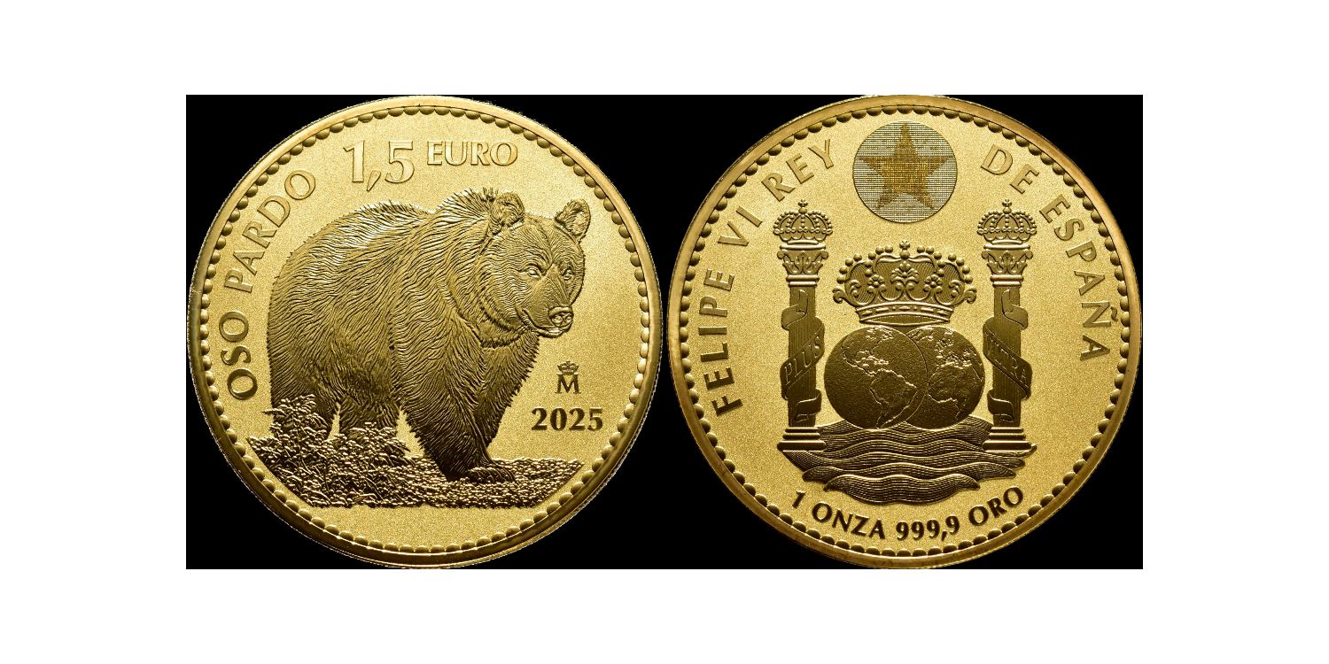 Fifth coin of the limited series (12.000) of the Spanish bullion dedicated to the Iberian Fauna. After the success of the first issues, dedicated to the Iberian Lynx, the Bull, the Carthusian Horse and the Imperial Eagle, the FNMT mints a new issue of one ounce of gold, in this case dedicated to the imposing Brown Bear, king of the mountains in the north of the Iberian Peninsula. It is a species in danger of extinction.