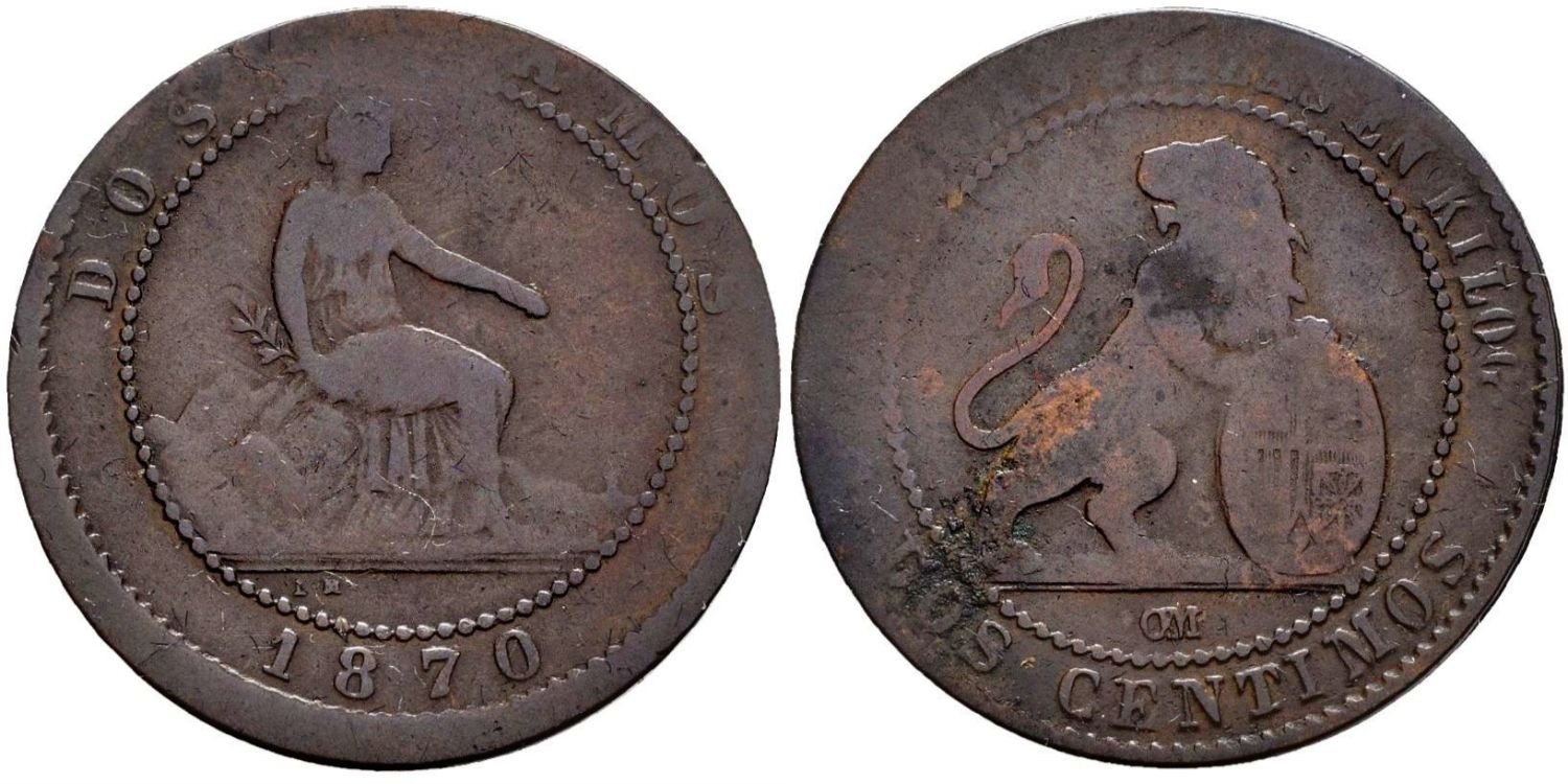 Cy16499v.- G.P. y REPUBLICA 2 Centimos 1870 BC Variety
