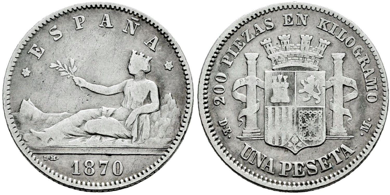 Cy16511c.- G.P. y REPUBLICA 1 Peseta 1870 (18-73) D.E.M. BC+