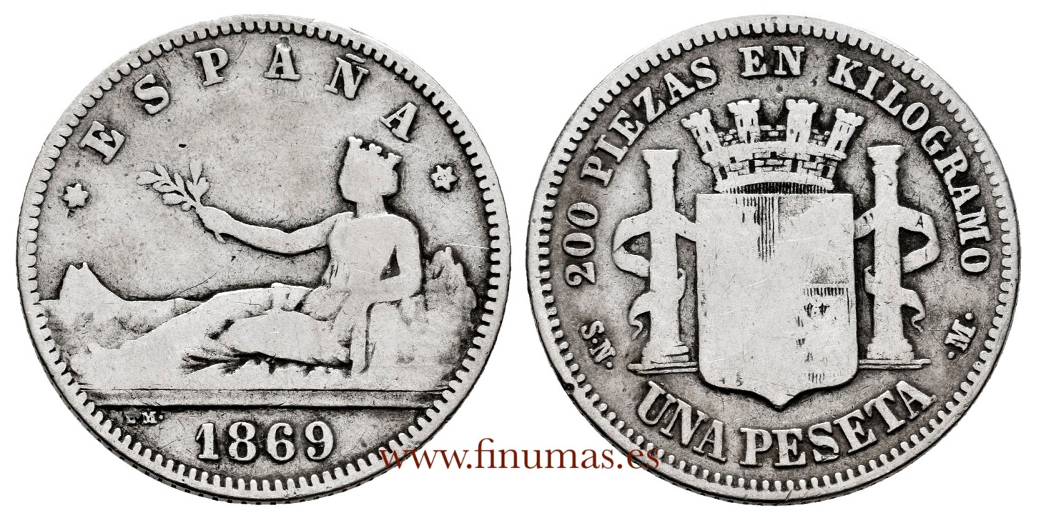 Cy16509.2.- G.P. and REPUBLICA 1 Peseta 1869 (18-69) Spain- B.C.