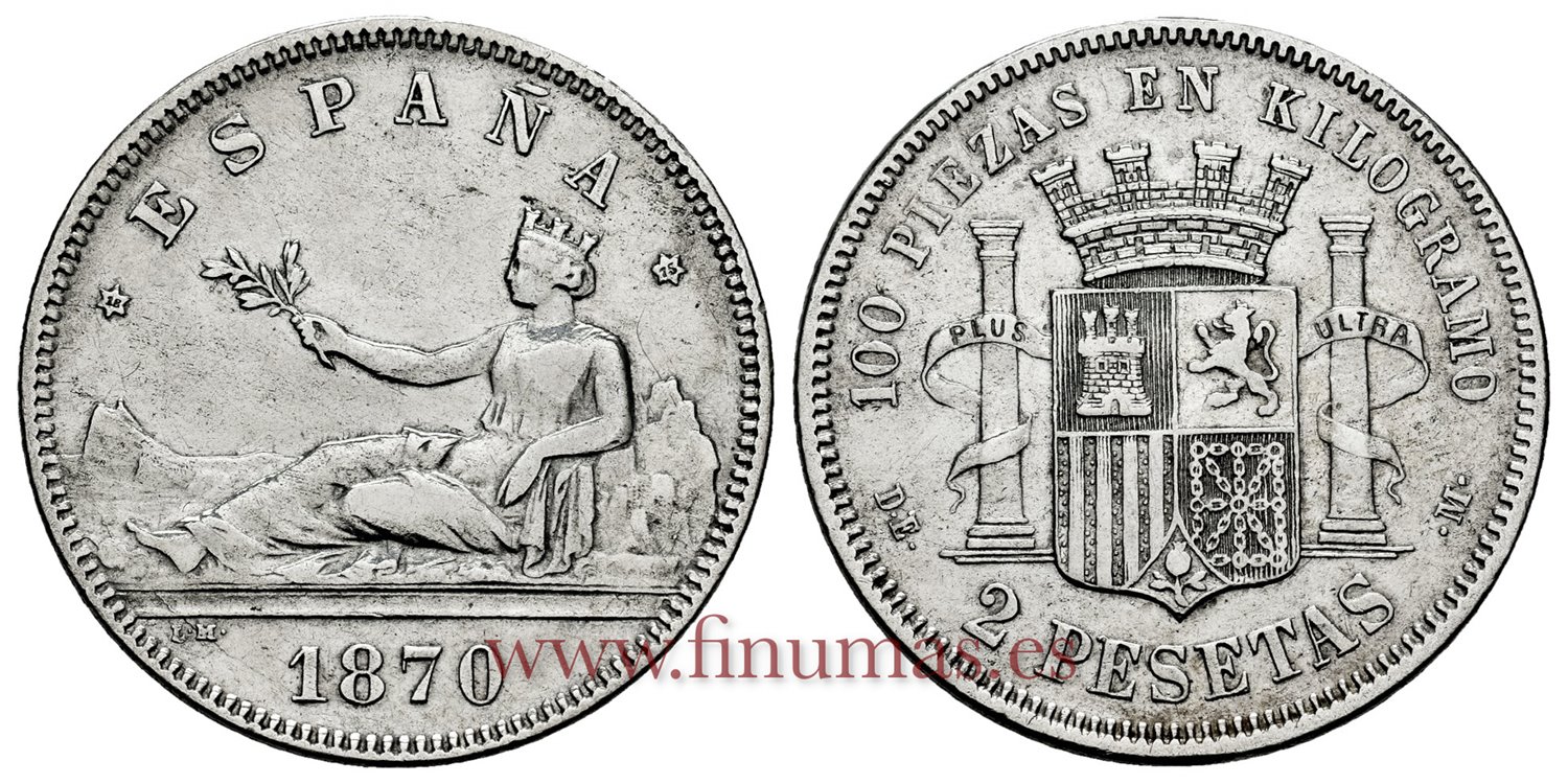 Cy16519F.- G.P Y I REPUBLICA - 2 Pesetas 1870 DEM (18-75) - MBC+