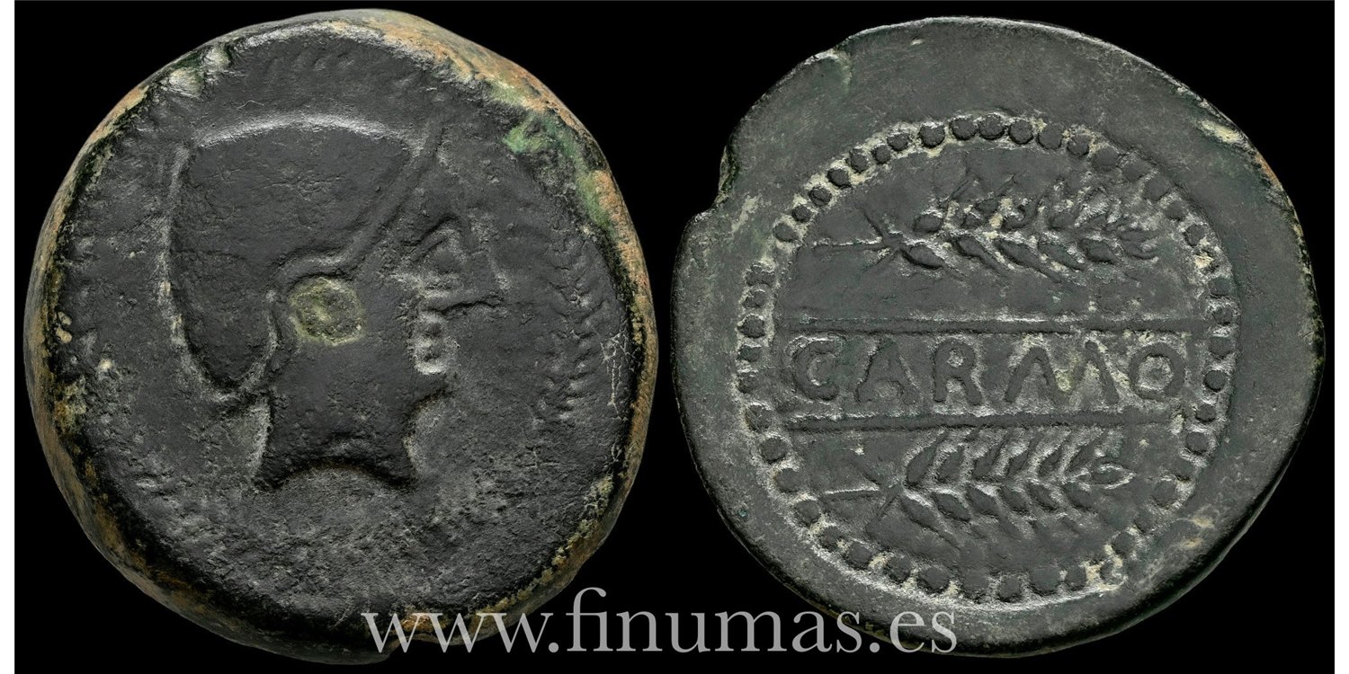 Carmo. As. 80 a.C. Carmona (Sevilla). (Abh-454 var.). (MIB-198/01b). Anv.: Dentro de láurea, cabeza masculina a derecha. Rev.: Dos espigas a derecha, entre ambas CARM⊙. Ae. 29,14 g. Campos ligeramente retocados en reverso. Reverso perfectamente centrado. MBC-/MBC+.