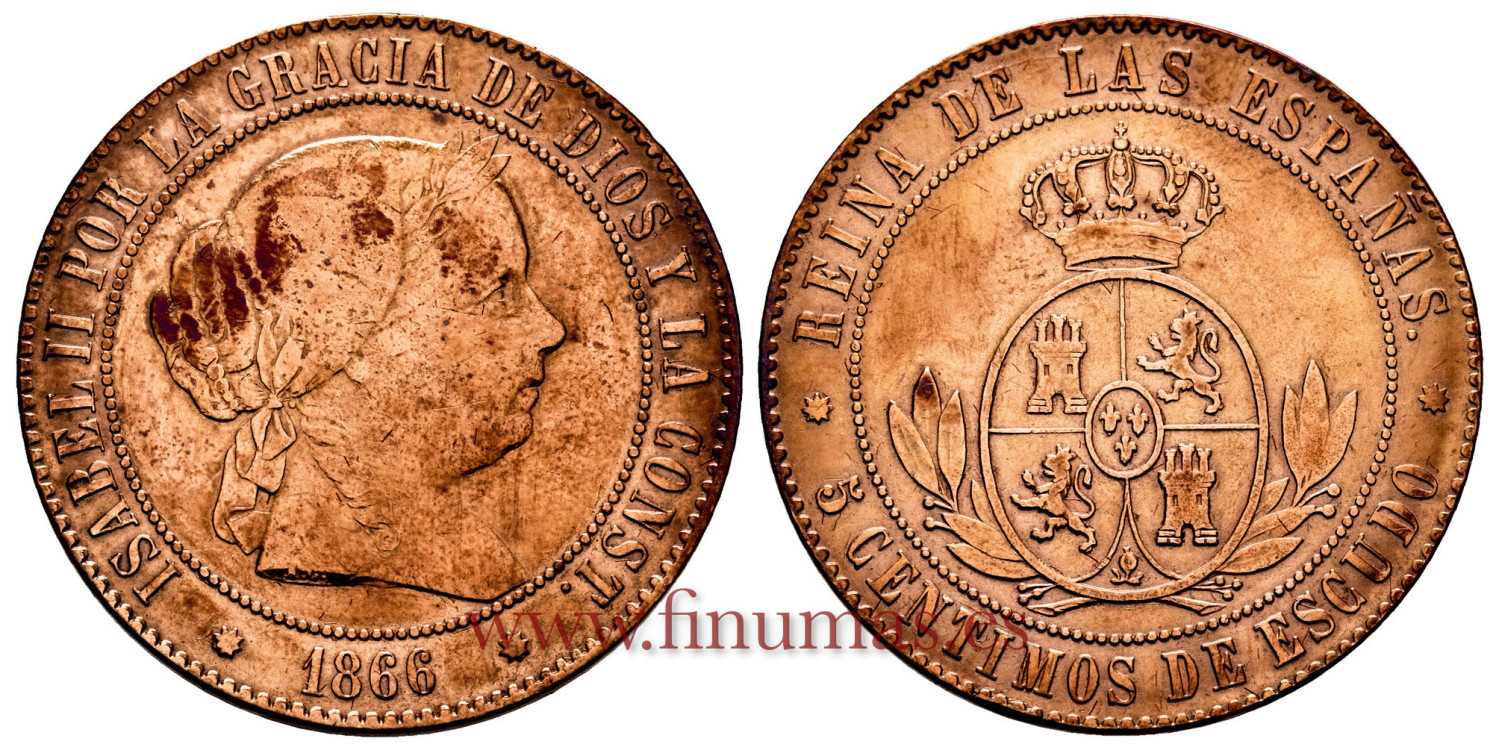 Cy15872.- ISABEL II - 5 Centimo de escudo 1866 Barcelona without OM - MBC