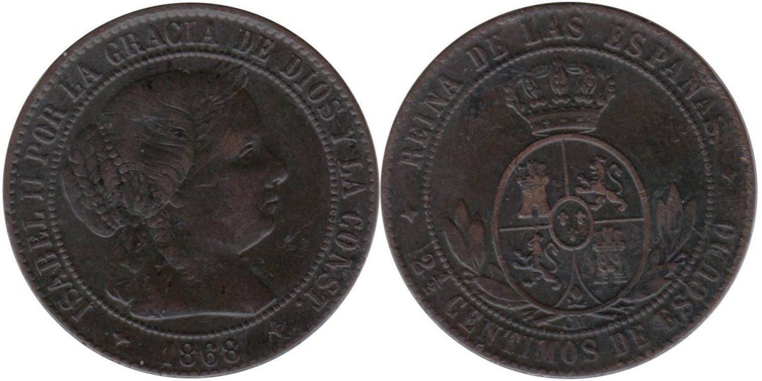 Cy15798.-ISABEL II - 2 1/2 Ctm. of Coat of Arms 1868 Jubia, MBC+