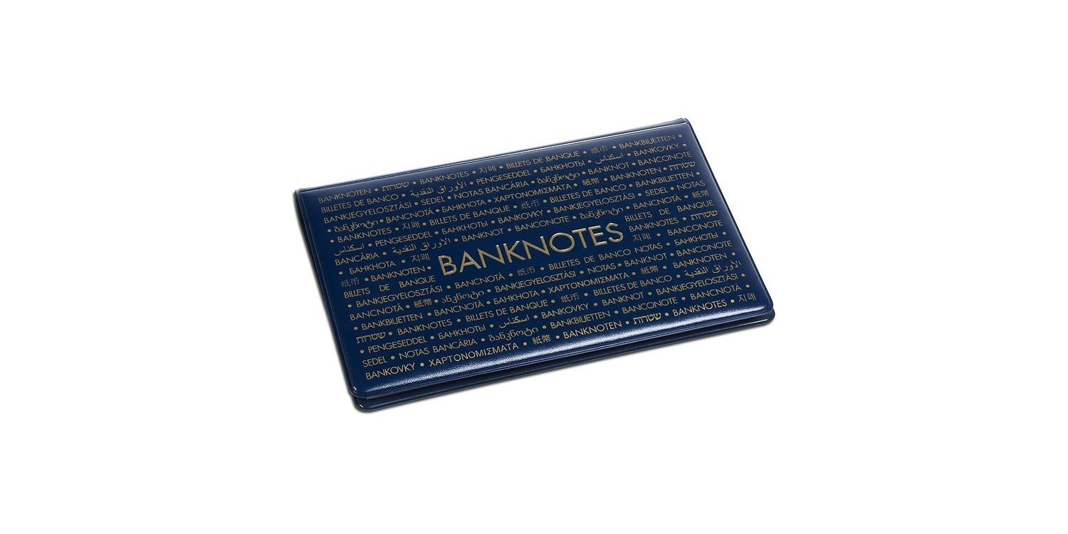 Handy pocket album for banknotes up to 210 x 125 mm. With 20 tightly bound transparent sleeves that allow the banknote to be seen from both sides. In a handy format, both albums fit easily into handbags, wallets or any pocket. Ideal for carrying with you and for exchange days. Padded covers. With a gold-coloured embossing on the cover. Colour: dark blue. Outer size: 230 x 20 x 155 mm.