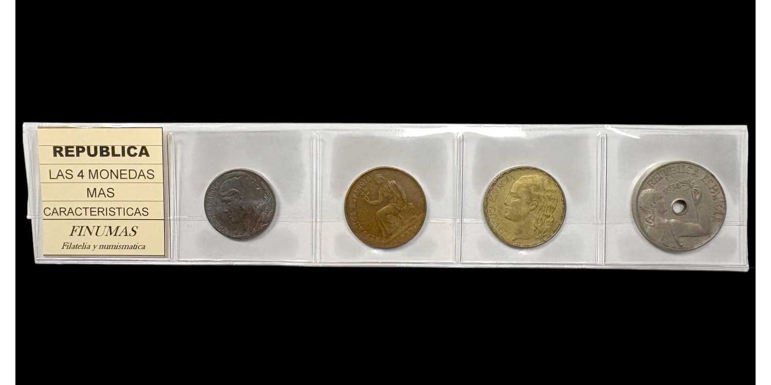 Collection that gathers the 4 most common coins with value in pesetas that existed during the government of the II Republic. All the coins are presented in cardboard and with their identification label