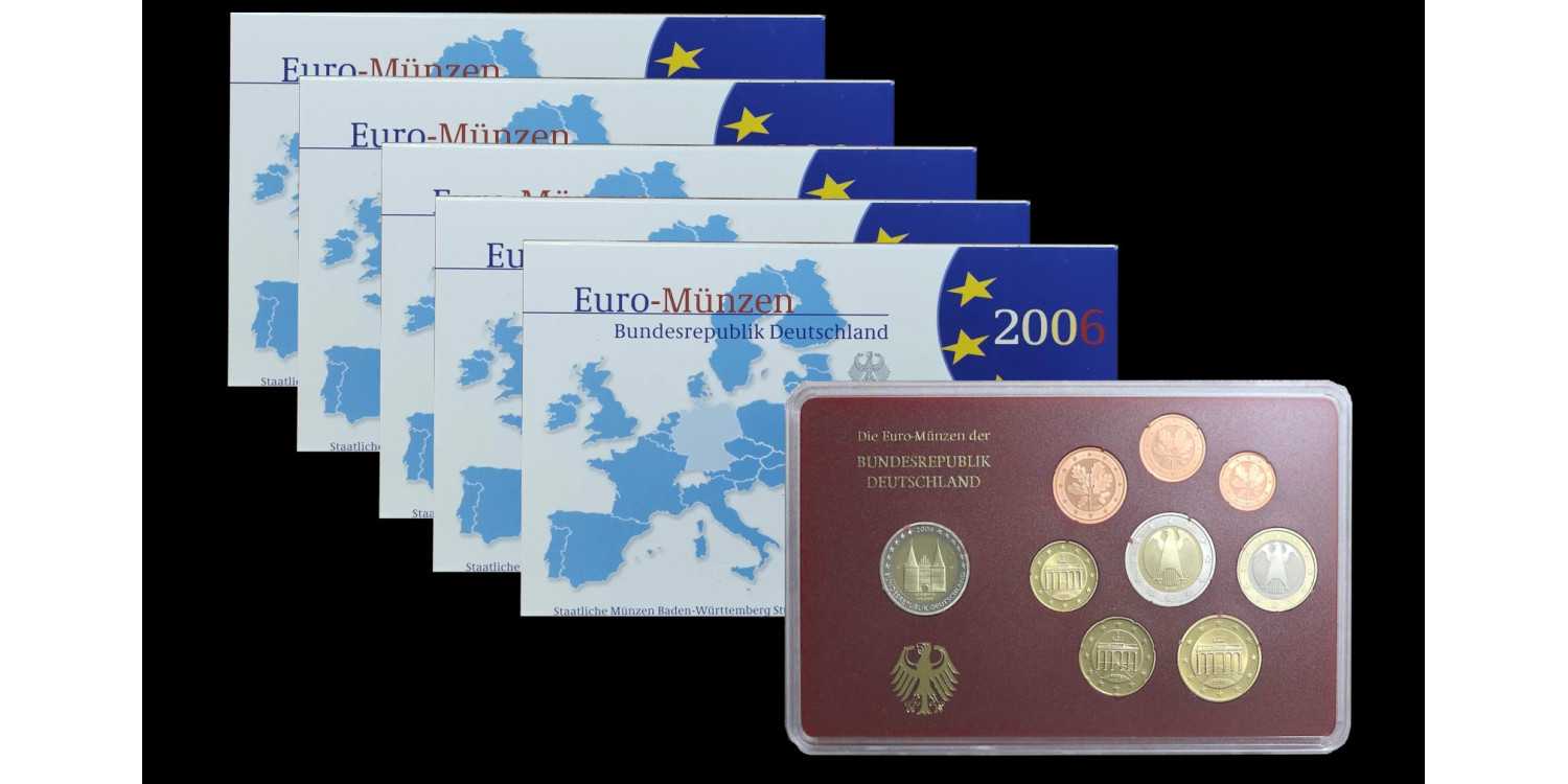 Set of the 5 official sets with the 9 values minted in 2006 in PROOF quality. Including the Schleswig-Holstein commemorative coin