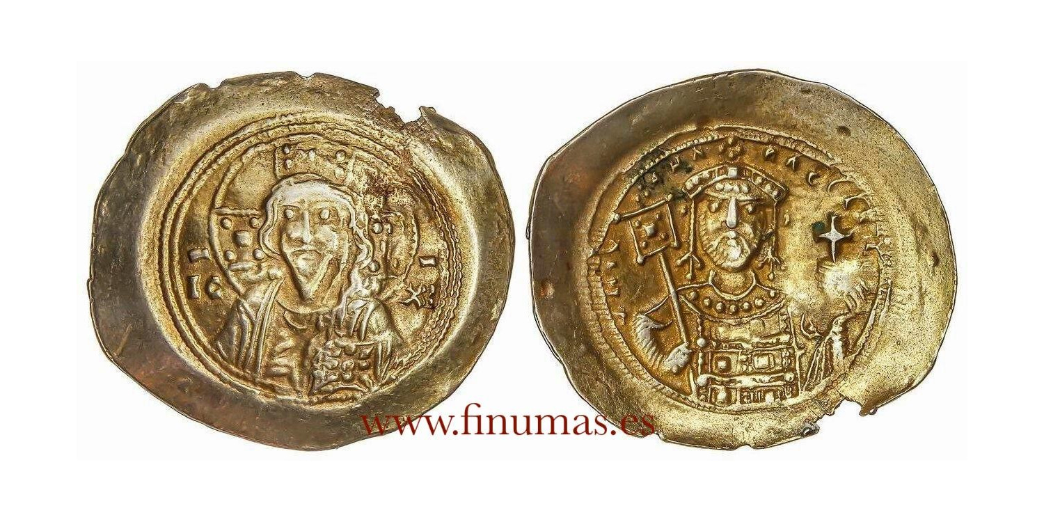 Histamenon Nomisma. MIGUEL VII (1071-1078 d.C.). CONSTANTINOPLE. Obverse: Bust of Christ facing, sides IC - XC. Rev.: ¶MIXACA RACIA (_). Bearded and crowned bust of Michael VII, with labarum and cruciferous globe facing. 3.70 grs. Electron. (Cospel slightly missing. Small rust spot). Se-1868 (MBC+). Ex-SoleryLLach 1112/191