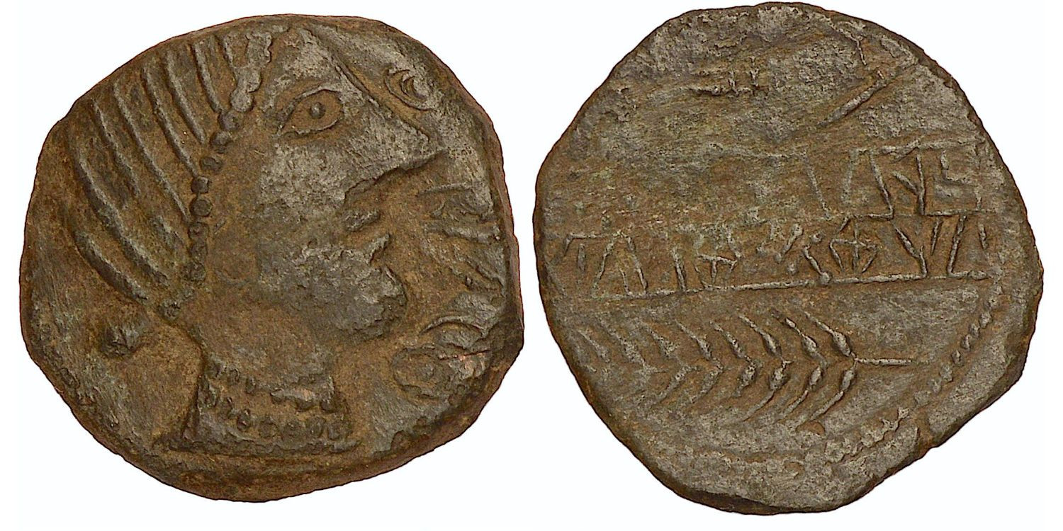 Obulco. As. 220-20 a.C. Porcuna (Jaén). Obverse: Female head right, in front OBVLCO. Rev.: URKAILTU / NESELTUKO between plough and ear of corn. Ae. 12,70 g. MBC. Brown Patina