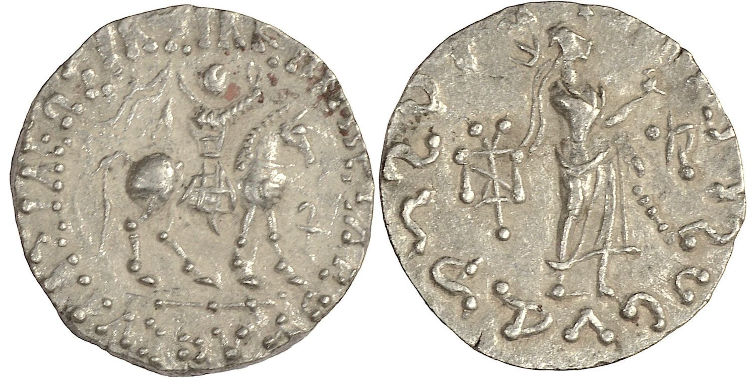 Tetradrachm of the Indo-Scythian kingdom (nomadic peoples of the Iranian plateau)ANV: Horseman right, with raised hand and symbols. Legend: BAIΛEΩΣ BAΣIΛEΩN MEΓAΛOΥ REV.: Poseidon right with trident with raised hand and symbols at sides. Caption: Maharajasa Rajadirajasa Mahatasa Ayasa. Silver Ag. 9`68gm ø23'5mm