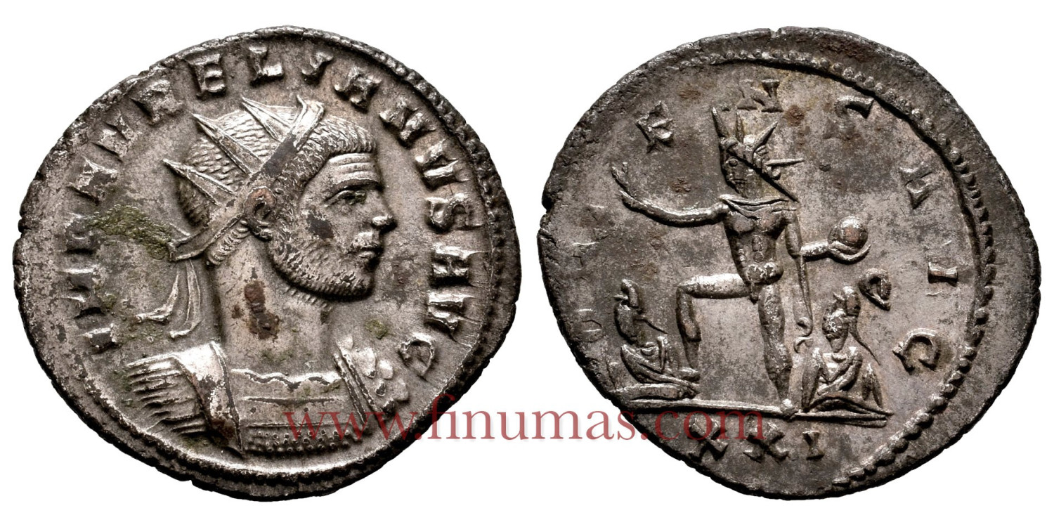 Aurelian Antoninianus. Cyzicus, 274 A.D. Anv: IMP AVRELIANVS AVG, radiate and cuirassed bust right Rev: ORIENS AVG, radiate Sun standing left, right hand raised, holding globe with left, and with one foot on captive, second bound captive seated right , XXI in exergue. RIC V.1 364; MER-RIC 3065 . 3.35 g, 24 mm. Remains of original lustre. Nice toning. Much nicer in EBC+/SC- hand