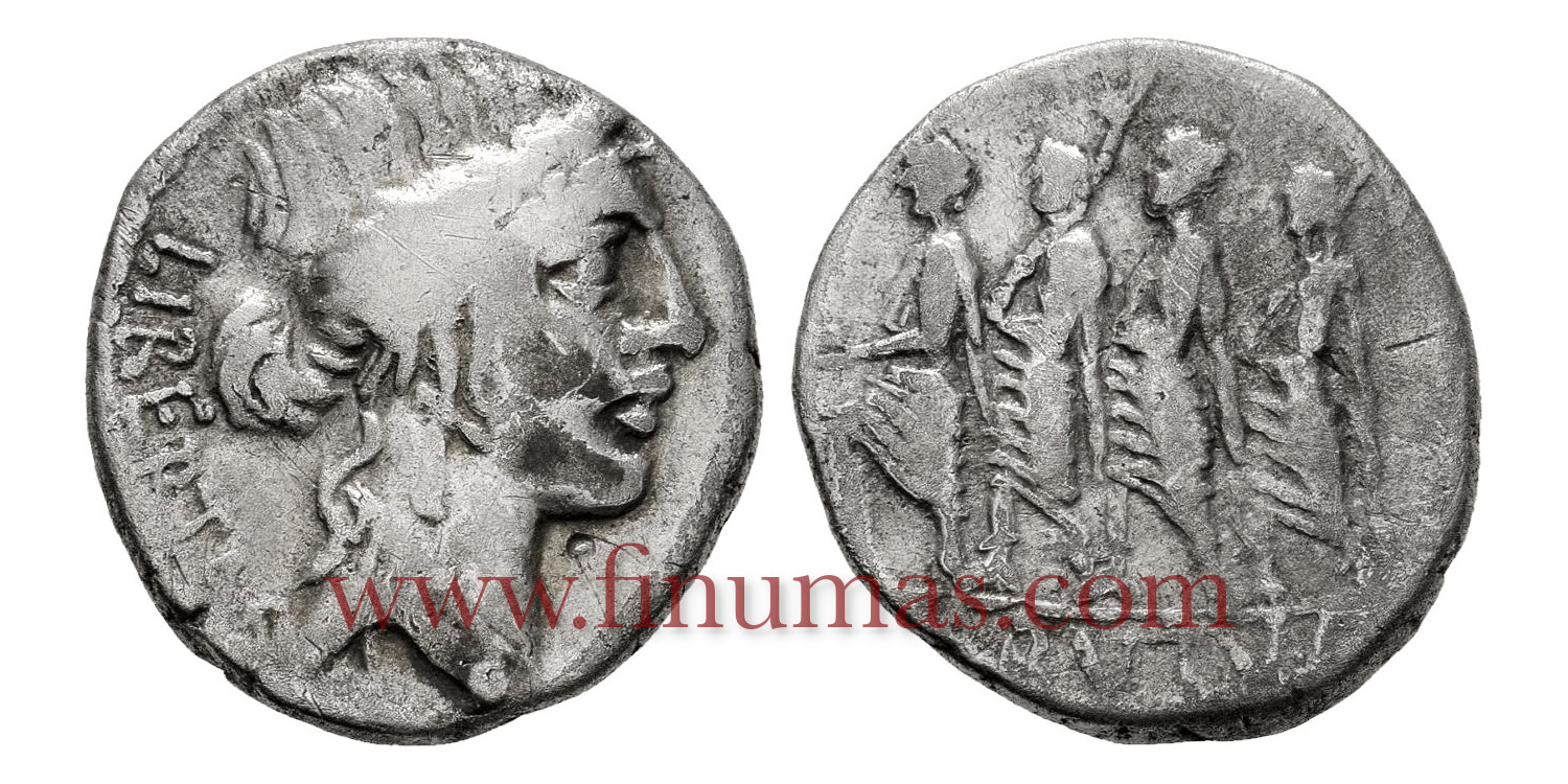 Denarius. 54 a.C. Junia. Q. Caepio Brutus. Rome. Obverse: Head of Liberty, with jewel on forehead, right, behind: LIBERTAS. Rev.: Brutus marching left between two lictors and preceded by an "accensus", in exergue: BRVTVS Ag 3,50gm. (Ffc-79