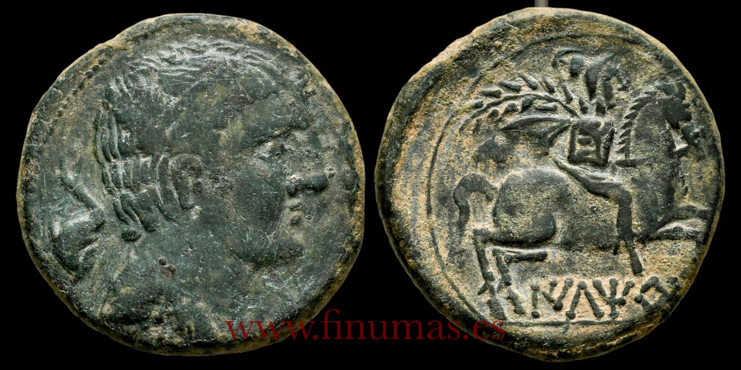 ILTIRTA (Lérida) As 200-20 a.C. Bronce (Ae.) 13,62g ø28mm). Anv: Cabeza masculina a derecha, alrededor tres delfines. Rev: Jinete con palma a derecha, debajo leyenda ibérica: ILTiRTa. FAB-1465. MBC+