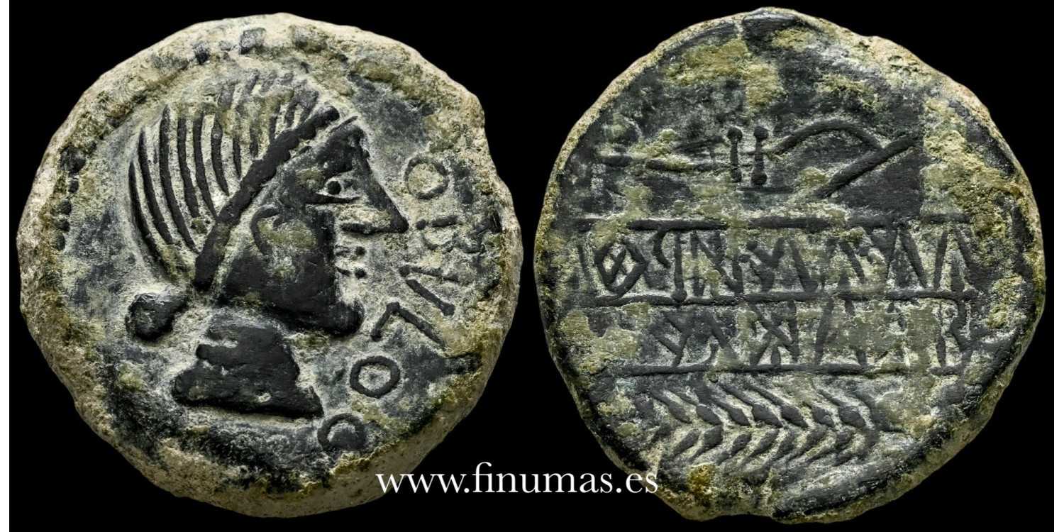 Obulco. As. 220-20 a.C. Porcuna (Jaén). Bronze (Ae.) 22,10 g Obv.: Female head right, in front OBVLOO. Reverse: Plough to left, below herringbone, between both Iberian legend to left inverted UIUIBORTUN/MUABOI. . MBC+ (Abh-1785) (MIB-159/11b) (Acip-2215).